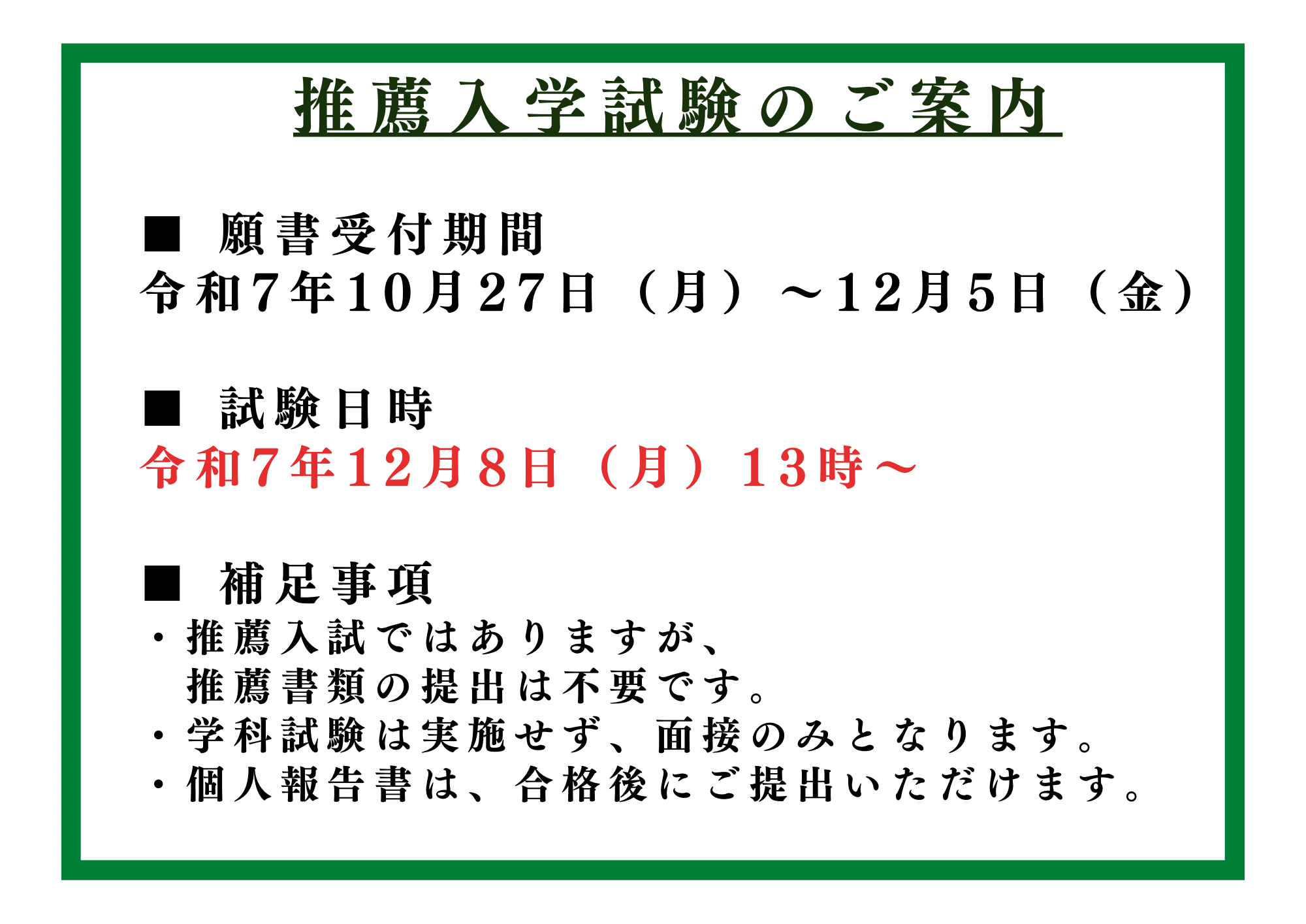 ※ 国語及び数学の試験はありません。学院長による面接のみで、試験終了後に合格発表を行います。