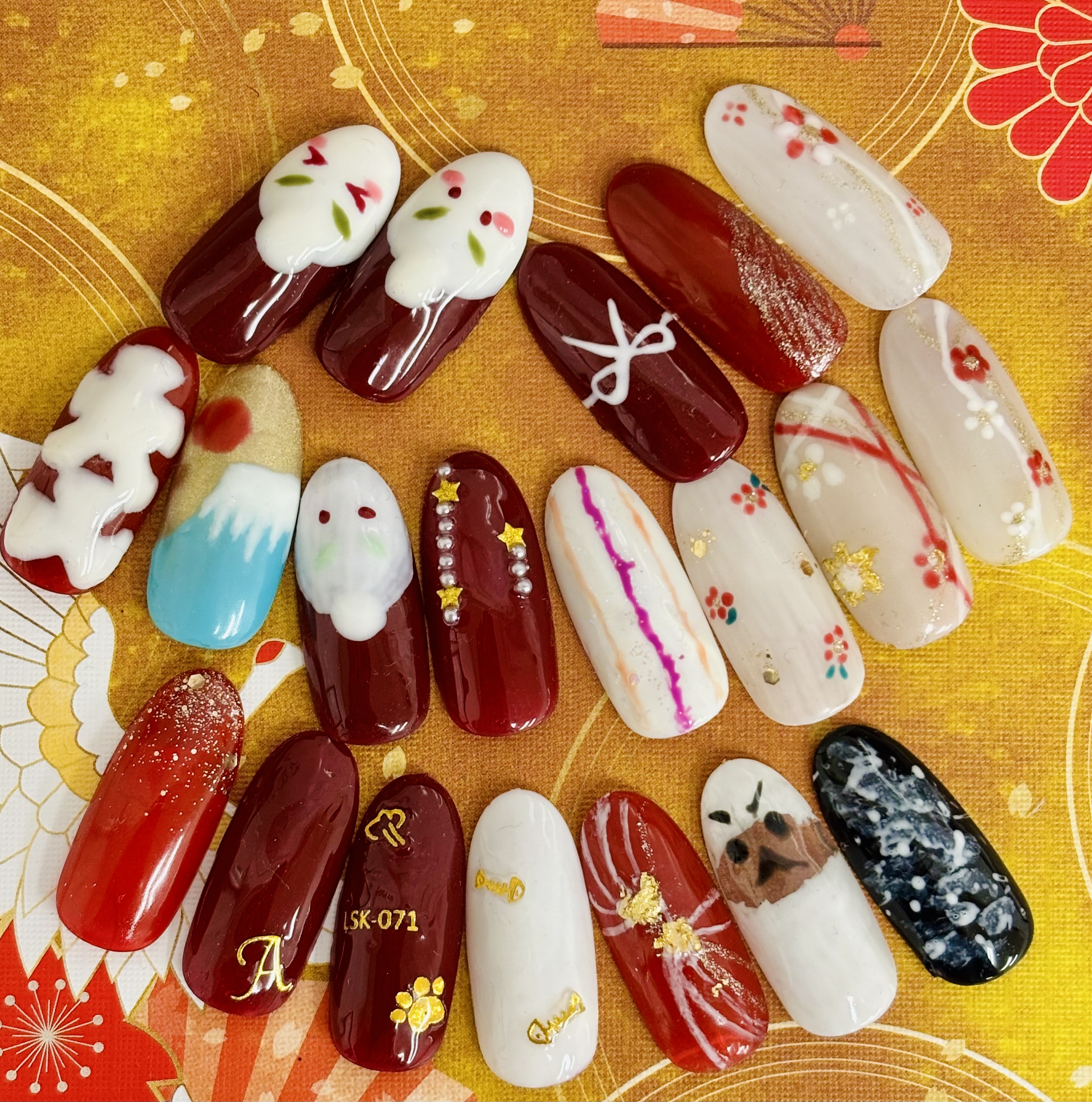 お正月をイメージして、ネイルチップを制作しました🧧赤・白・金をベースに、だるまやうさぎ、富士山などの縁起の良いモチーフを取り入れ、ひとつひとつ自分でデザインしています。 新しい一年にぴったりな、明るい気持ちになる素敵なネイルです💓
